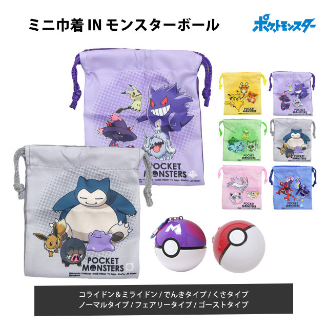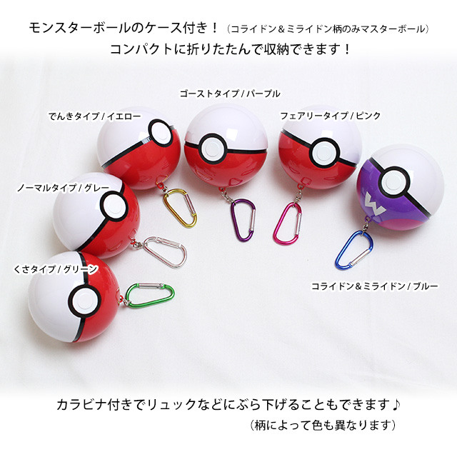 ポケモンプリント入りの巾着袋がコンパクトに畳んで収納できる モンスターボール型のケース付き