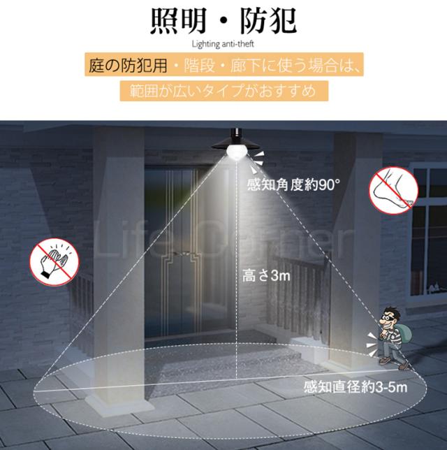 光センサー:明るさが80luxを超える場合は点灯しません。