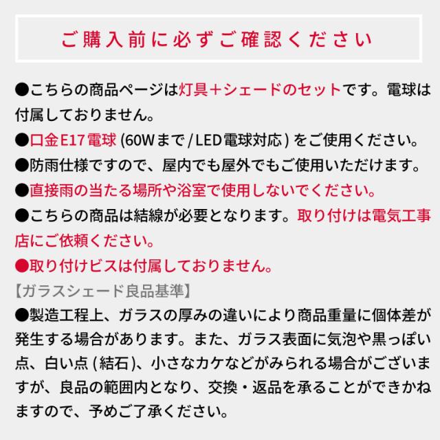 | ご使用上の注意 | ※直接雨の当たる場所や浴室で使用しないでください。 ※こちらの商品は結線が必要となります。取付けは電気工事店にご依頼ください。 ※施工に不備があると火災、感電、落下の原因になります。 ※下記の使用環境、条件下でのご使用や取付けはしないでください。 ・排熱機器付近や周囲の温度が常時35℃以上の湿気に晒される場所 ・過度に湿気の多い場所や、常に85%以上の湿気に晒される場所 ※凸凹のある壁面には取付けないでください。火災、感電、漏電の原因になります。 ※取付け時は必ず電源を切ってから作業をしてください。感電の原因になります。 ※電球の交換や器具の保守、点検時にかかる力に耐えられる十分強度のある壁面に取付けてください。 ※取付ける壁に合ったビスをご使用ください。 ※取付けが不十分の場合ネジの部分から雨水の侵入や、器具の落下原因に繋がります。 ※シェードは製造工程上、ガラスの厚みの違いにより商品重量に個体差が発生する場合があります。 ※光源が目に入りやすいので、吊るす高さや場所を工夫して、眩しく感じないちょうどいい位置にご調整ください。 |