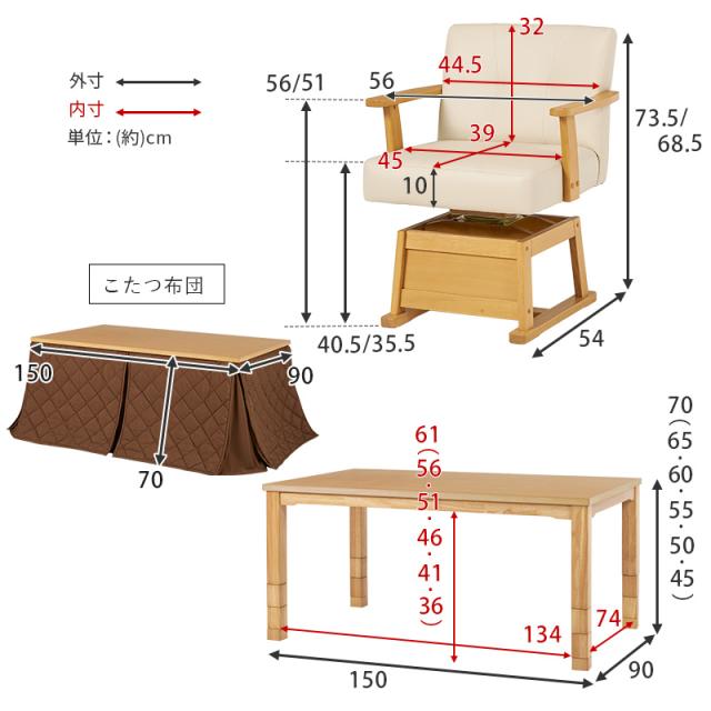 こたつ:(約)幅150×奥行90×高さ45/50/55/60/65/70cm