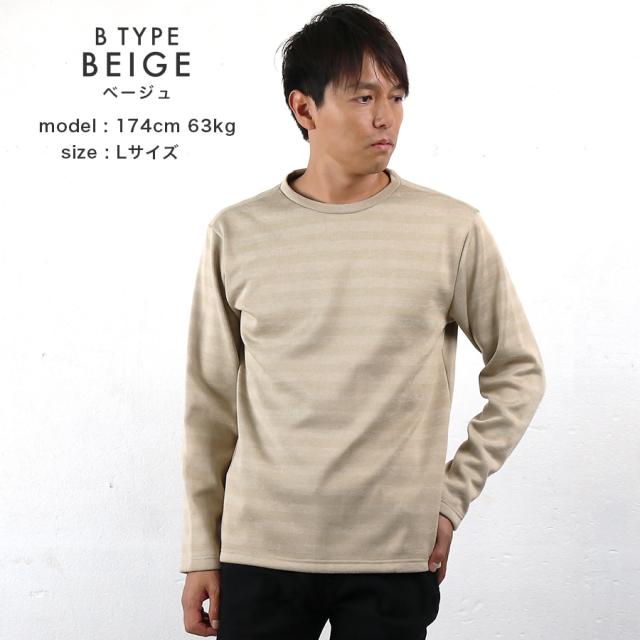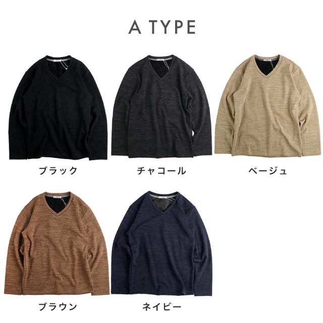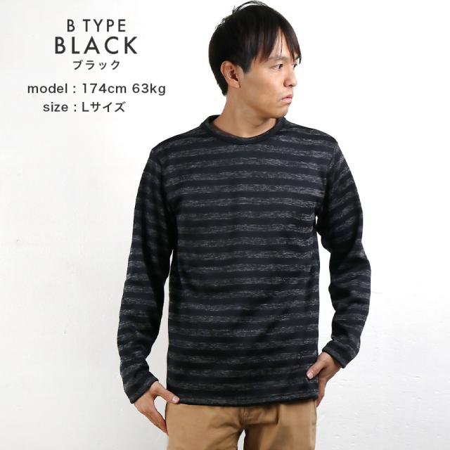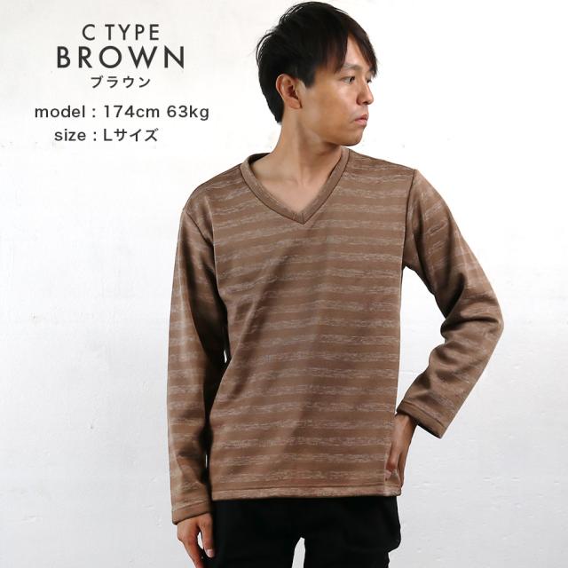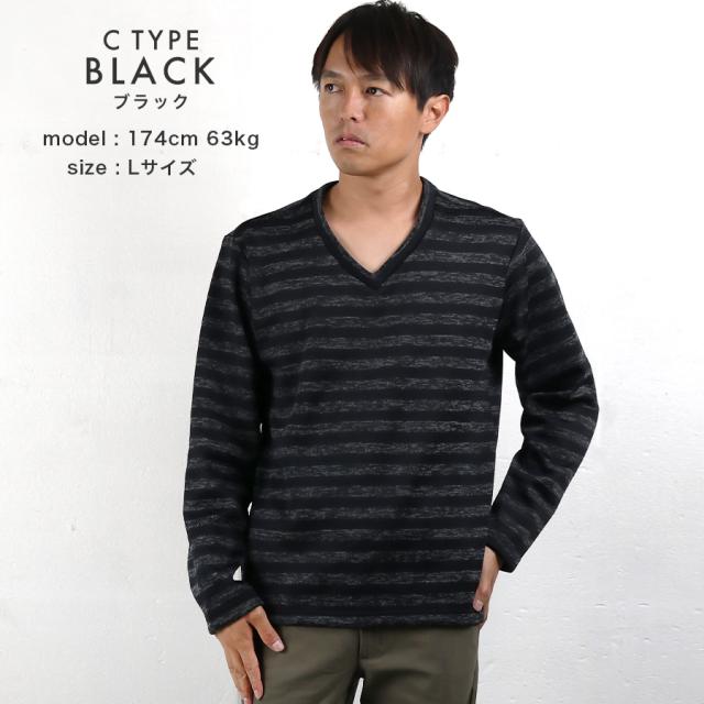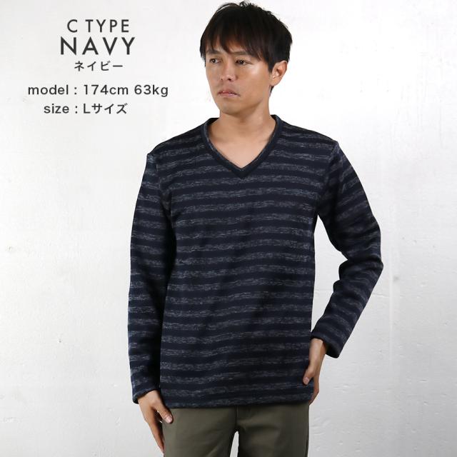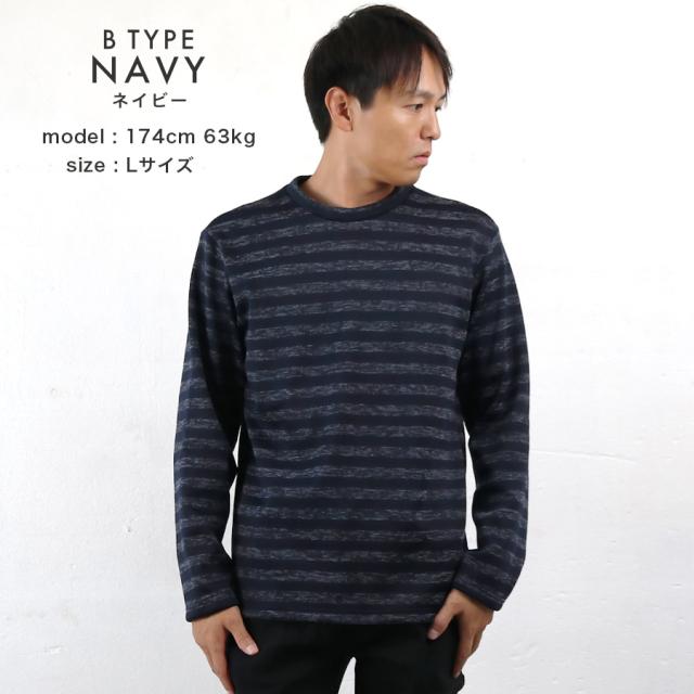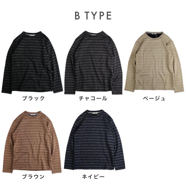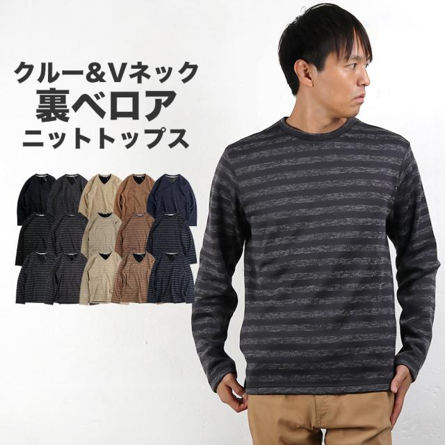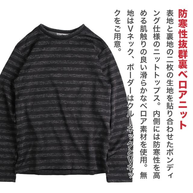ニット メンズ Tシャツ 長袖Tシャツ ロンT 裏ベロア 裏起毛 裏ボア 無地 ボーダー クルーネック Vネック