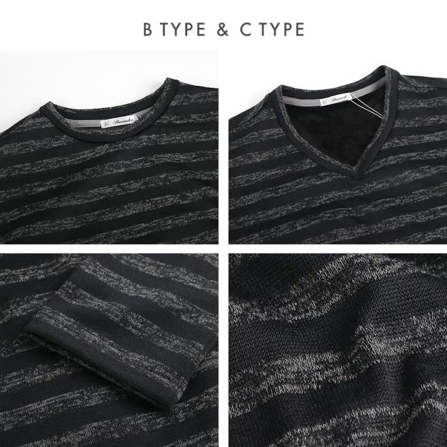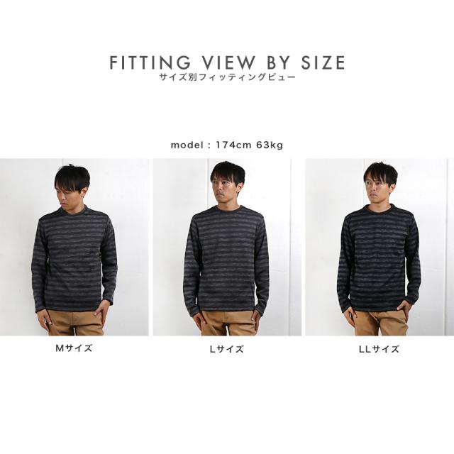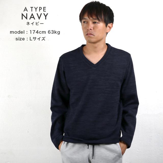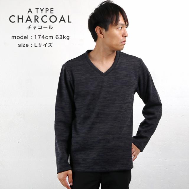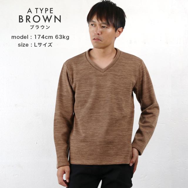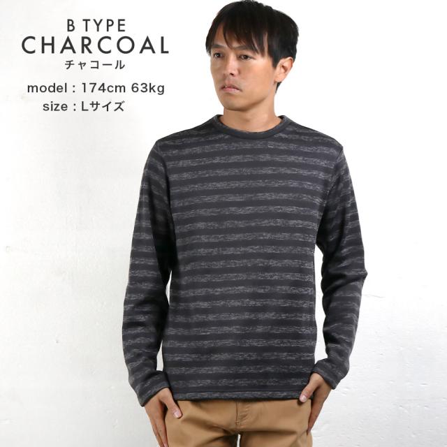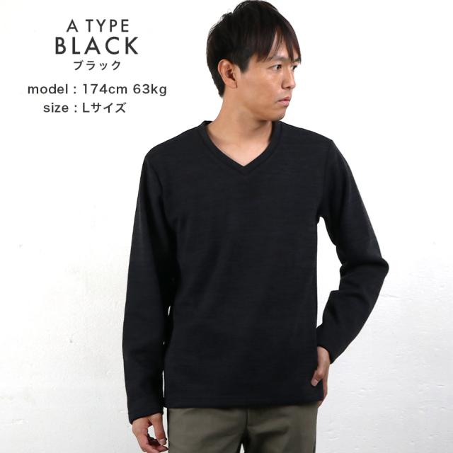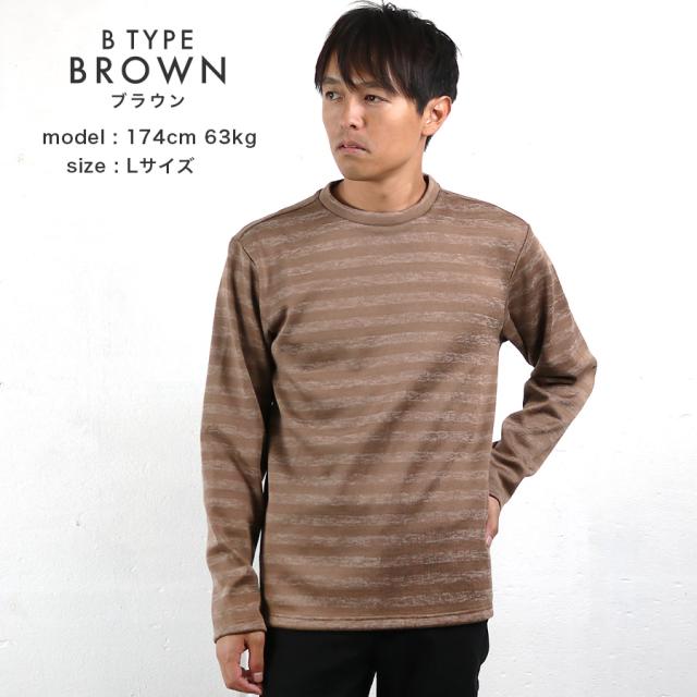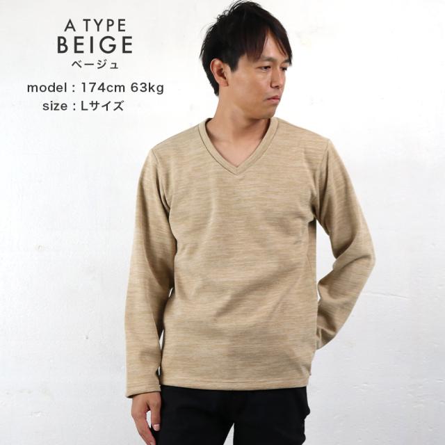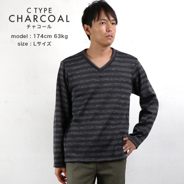ニット メンズ Tシャツ 長袖Tシャツ ロンT 裏ベロア 裏起毛 裏ボア 無地 ボーダー クルーネック Vネック