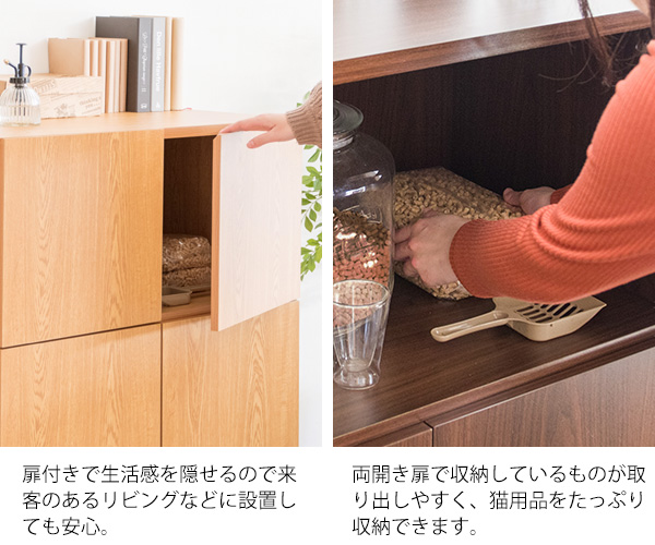 猫が出入りできる左右の穴は段差があるので猫砂が外に飛び散りにくく、毎日のお掃除の負担を軽減してくれます。左右に開く扉付きでお掃除もラクラク。