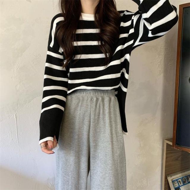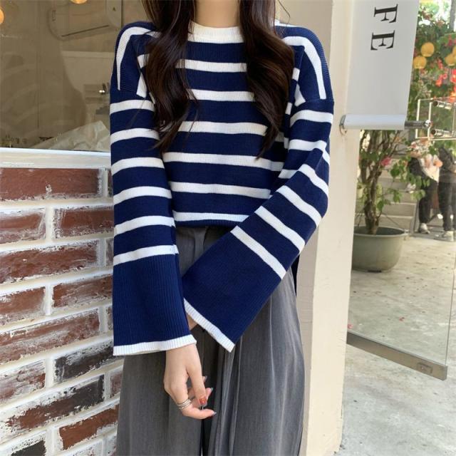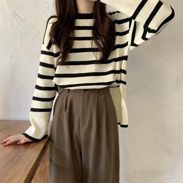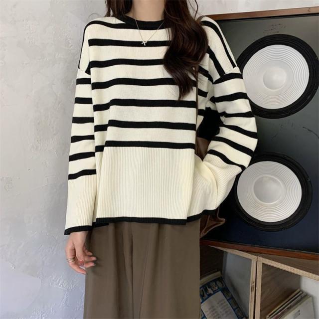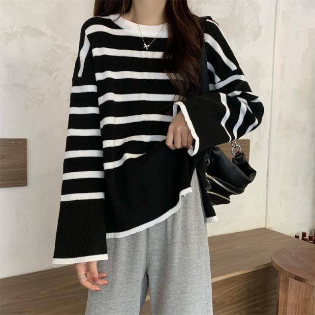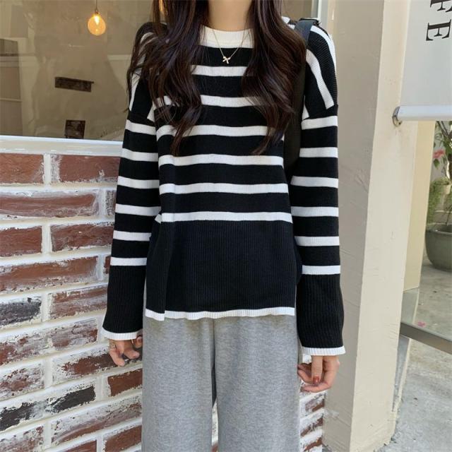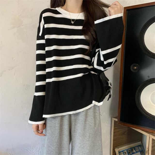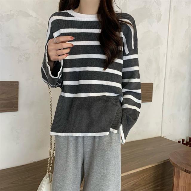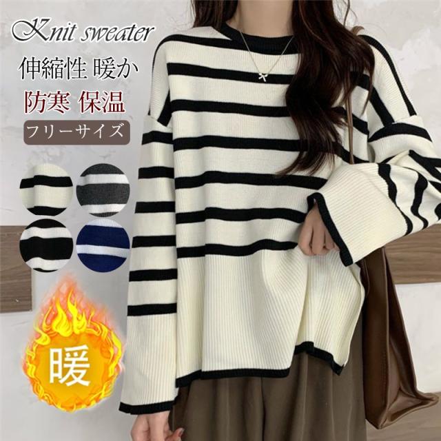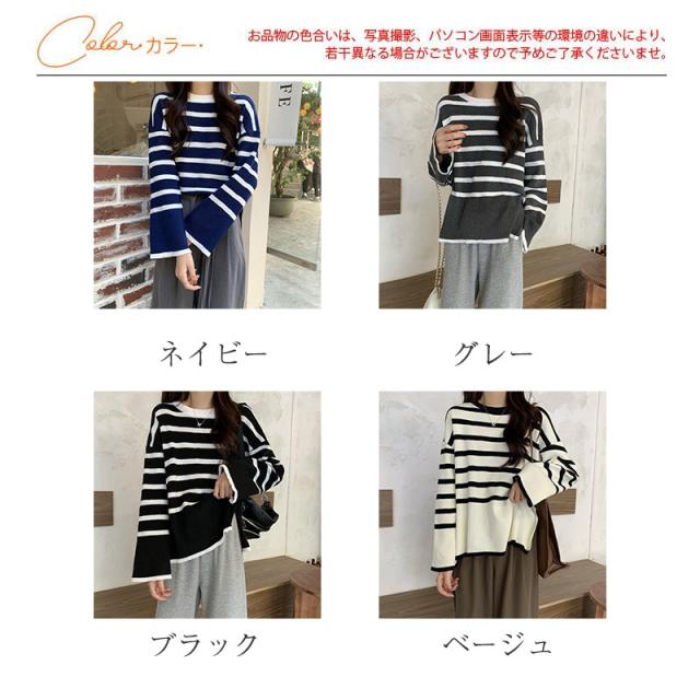 ニットセーター レディース ニット ストライプ セーター クルーネック プルオーバー 長袖 薄手 ゆったり 防寒 ルーズ 秋冬 着