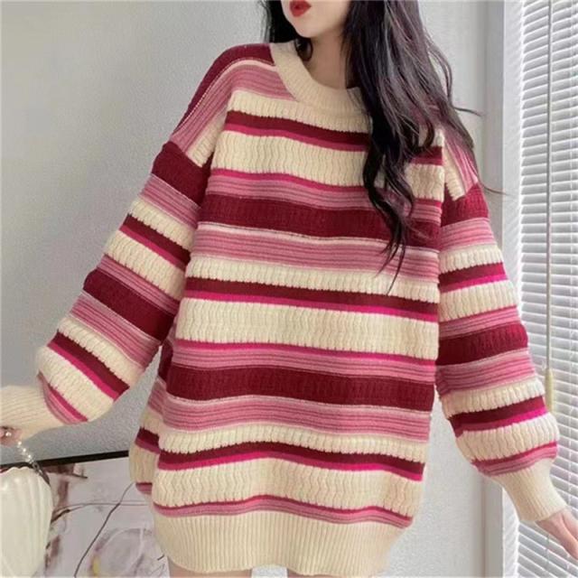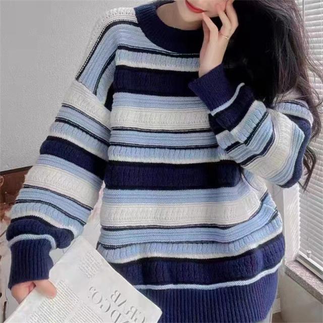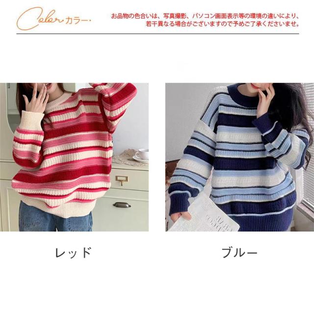 ニットセーター レディース ニット ストライプ セーター トレーナー クルーネック プルオーバー 長袖 ゆったり 暖かい 防寒 秋