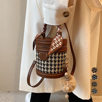 筒型バッグ レトロ 小さめ 2way鞄 ハンドバッグ 手提げかばん 千鳥柄 肩掛けバッグ スカーフ付き キーホルダー付きコンパクトバッグ キューブバッグ ミニバニティバッグ