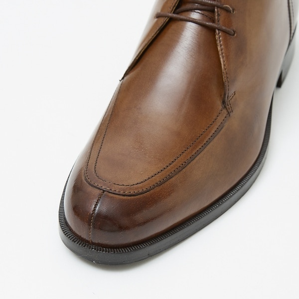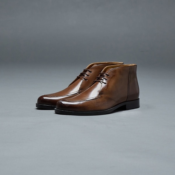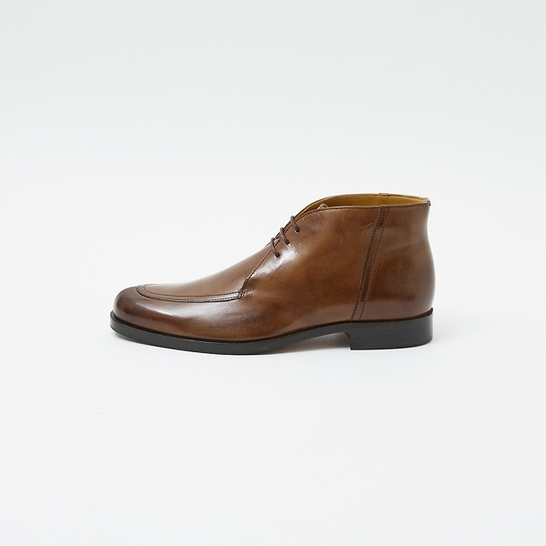 光沢のある牛革を使った上品な見た目のチャッカブーツに、程よくカジュアル感がでるUチップ合わせたモデル。