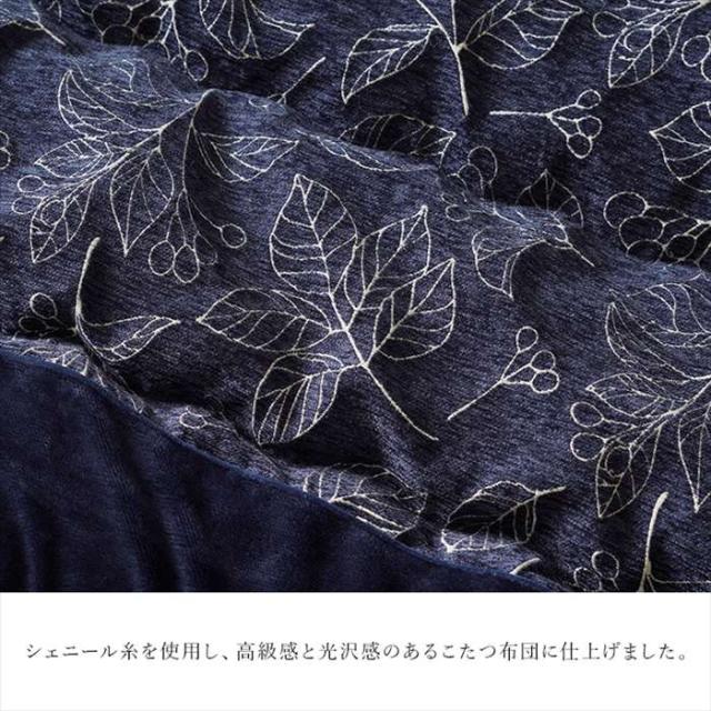こたつ布団 単品。正方形 約205×205cmカラーは、アイボリー(4550317218675:1161350140103)、ネイビー(4550317218705:1161350190103)、です。シンプルと北欧柄がほどよくミックスされ、高見えするこたつ布団。シェニール糸を使用し、高級感と光沢感のあるこたつ布団に仕上げました。ふっくらとしたボリューム感は国内で綿入加工をしている商品だからできる仕上がりです。裏地にはあったか素材のフランネルを使用しています。同じデザインのクッションを取り入れて、統一感のあるお部屋にアレンジもできます。※モール糸を使用しているため、粘着クリーナーでお掃除されますと繊維が抜けることがあります。ご使用はお控えください。※こたつ台、敷布団は別売りです。※ふとんをやぐらの中に押し込んだり、座イスやイス全体をこたつの中に入れたまま使用しないでください。ふとんがヒーターに当たらないようにご使用ください。(火災の原因になります)ご使用により、ふとんが焦げた場合につきましては、返品・交換を承ることができませんので、あらかじめご了承ください。※掲載写真は表記サイズと異なる場合がございます。