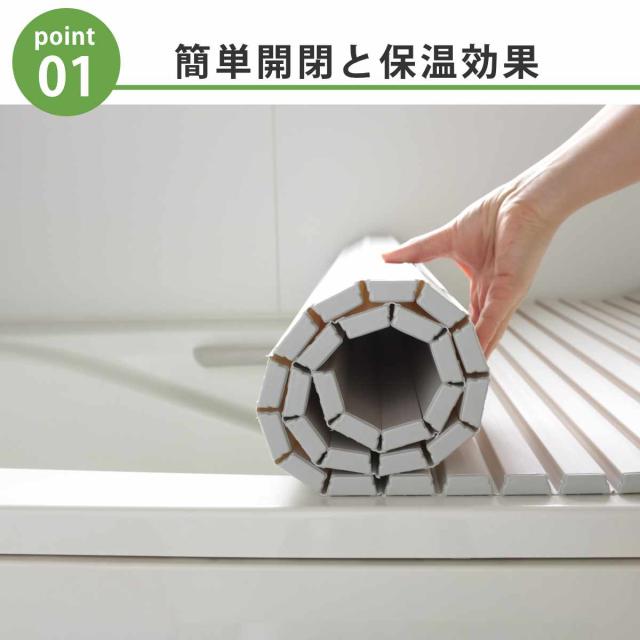 巻きながら開閉するシャッタータイプの風呂ふたです。巻き始めから最後まで軽い力でくるくると巻けるため、お子様や高齢の方でも簡単です。入浴の際に全て開けず半開きにすれば、お湯が冷めにくく保温効果が期待できます。