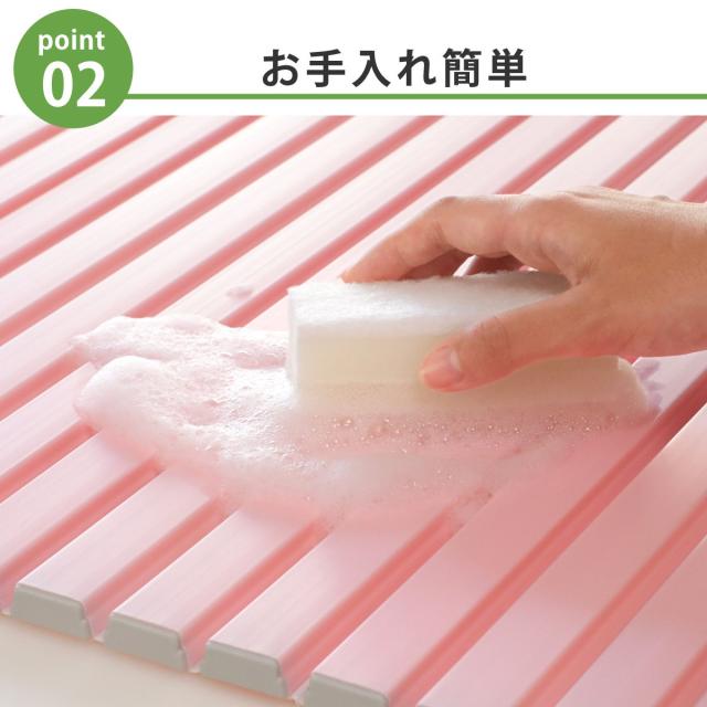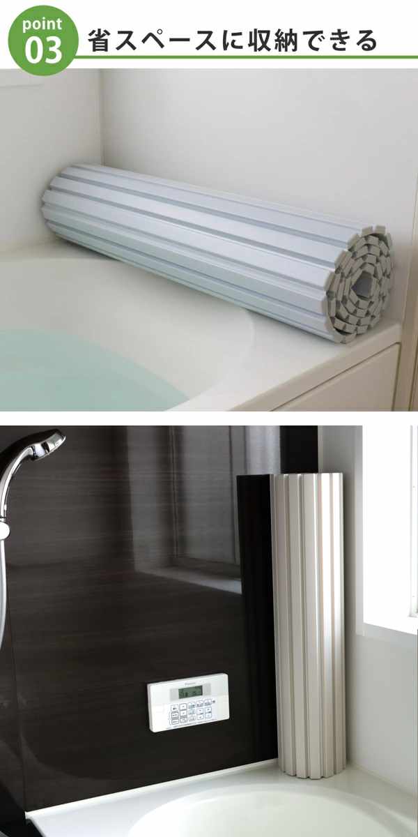 コンパクトに丸めて省スペースで収納ができるので、アパートなどの狭いお風呂にも最適です。また、浴室に立てかけての収納や、浴槽に寝かせての収納など、お好みに合わせて収納していただけます。
