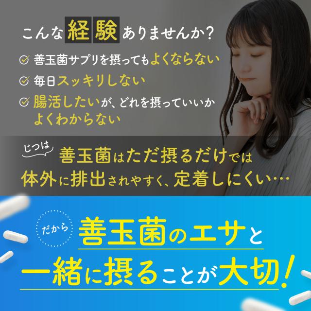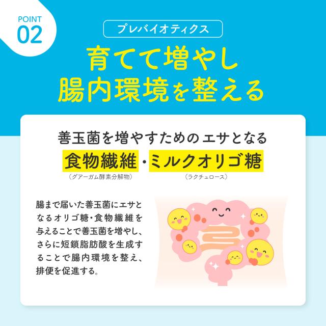 | 原材料 | デンプン(国内製造)、グアーガム酵素分解物(食物繊維)、ラクチュロース、有胞子性乳酸菌末( 乳糖、有胞子性乳酸菌)、ビフィズス菌末/HPMC、ステアリン酸カルシウム |