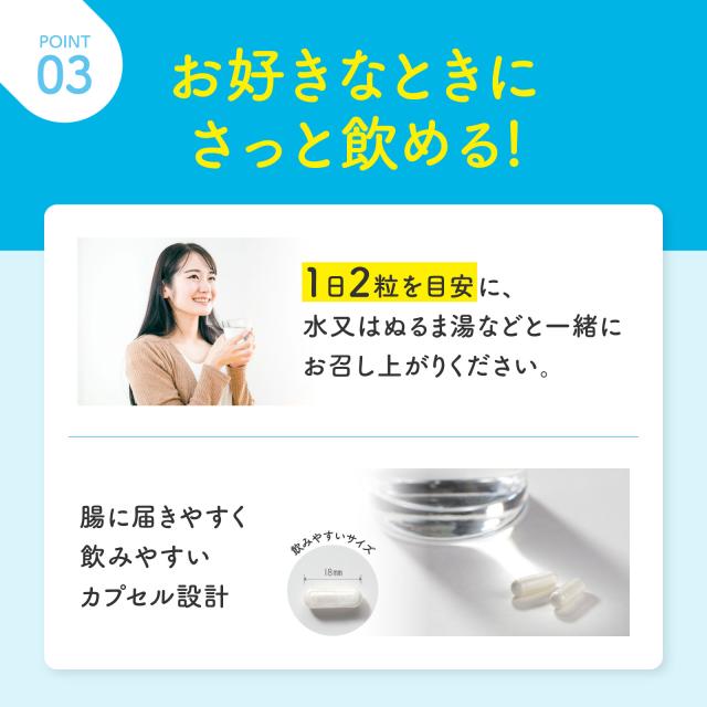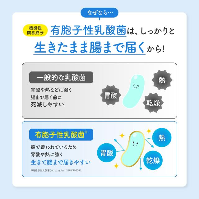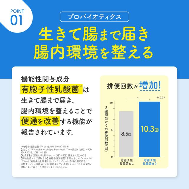 | 届出表示 | 本品は有胞子性乳酸菌(Weizmannia coagulans SANK70258)を含みます。有胞子性乳酸菌(W. coagulans SANK70258)は、生きて腸まで届き、腸内環境を整えることで便通を改善する機能が報告されています。 |