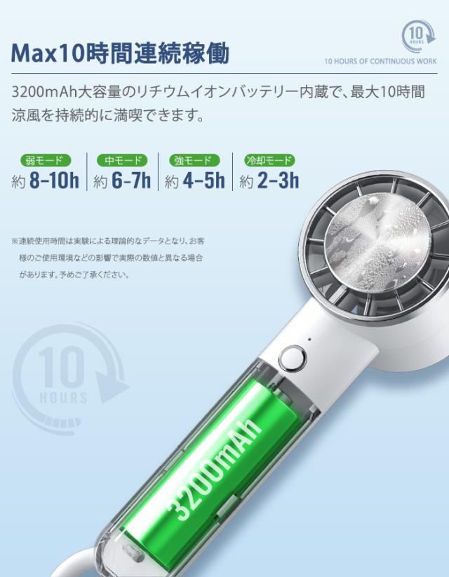 ■3200mAh大容量のリチウムイオンバッテリー内蔵で、最大10時間涼風を持続的に満喫できます。