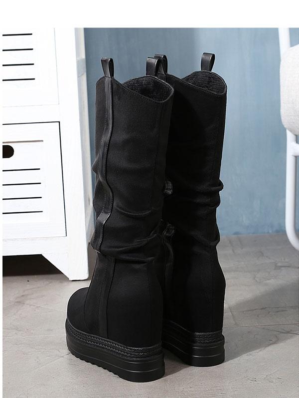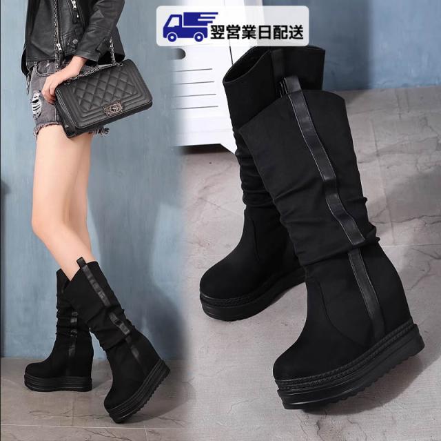 【翌営業日発送】ミドルブーツ 厚底 「ボア無し」ブーツ ヒール10cm ロングブーツ くしゅくしゅブーツ 【黒 24.5cm】 ウエッジソール 美脚 カジュアル レディース ファッション シューズ 靴 秋 冬 春 20代 30代 40代 ブラック