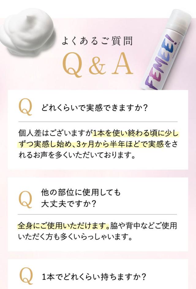 | 1.ぬるま湯でしっかり予洗いしてください。 2.缶を上下によく振り、容器を立てたまま適量(たまご1個分程度)を手のひらに取ります。 3.気になる部位(デリケートゾーン・ワキ等)にムラなく塗布し、泡でやさしくマッサージするようによく洗い、しっかりすすいでください。 |