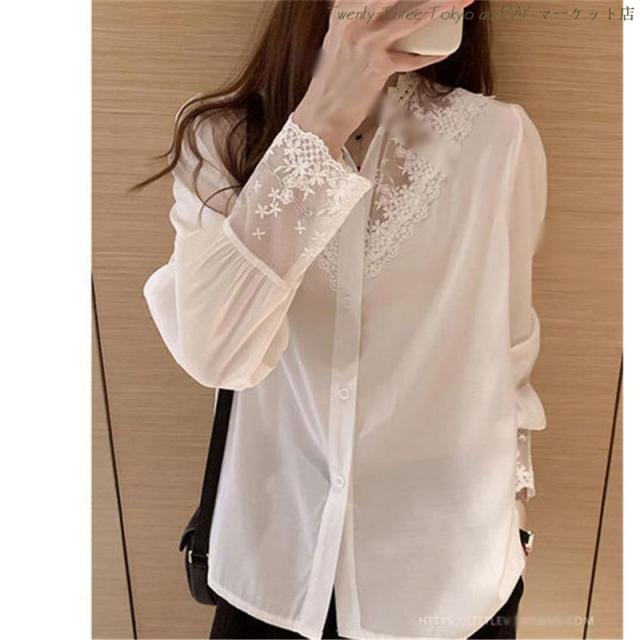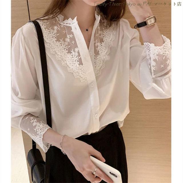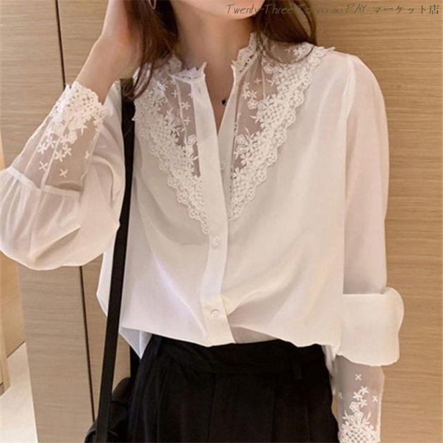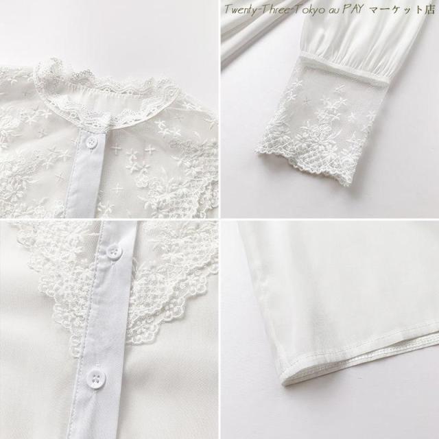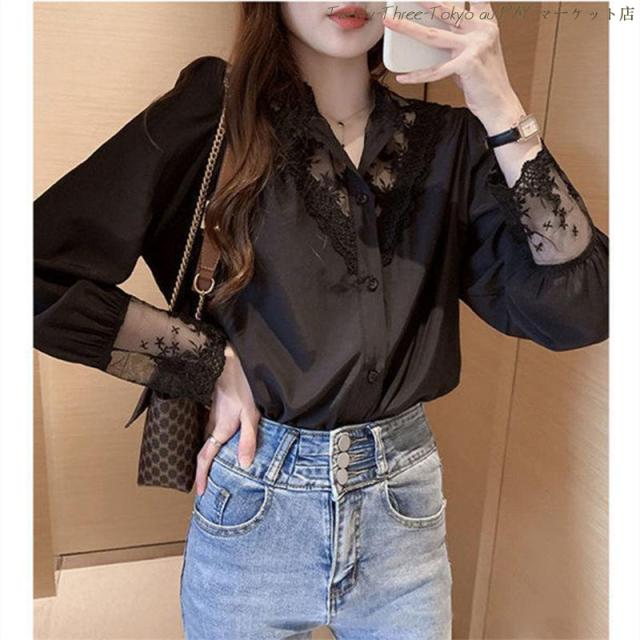 【三太郎の日】シャツブラウス シフォンブラウス レース切り替え 黒 白 長袖 レディース トップス 可愛い 花柄 おしゃれ カジュアル