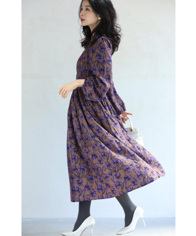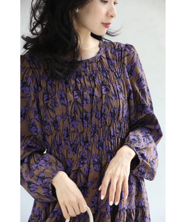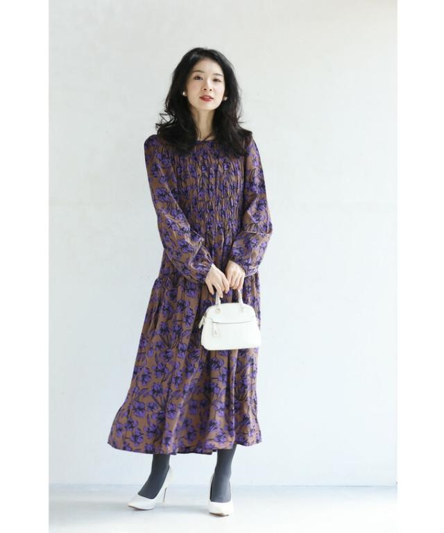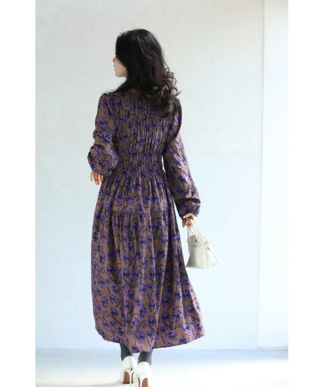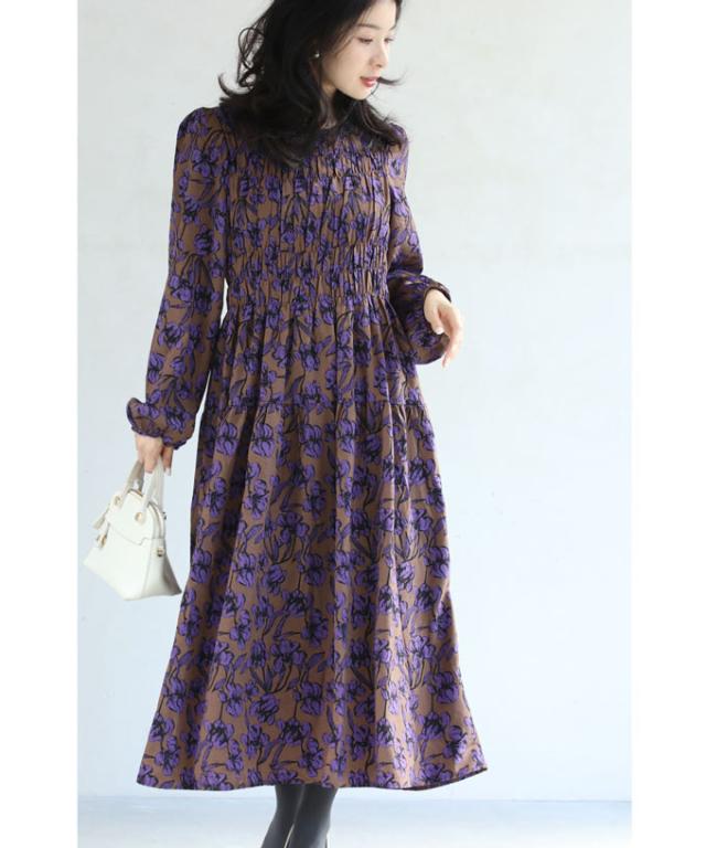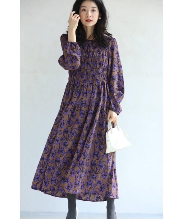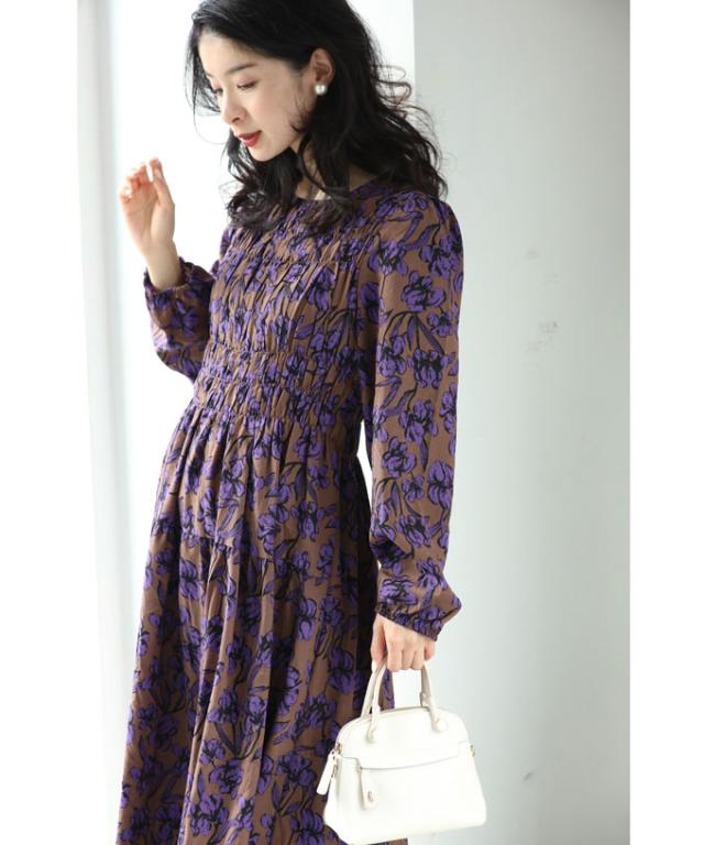 再入荷9月4日 凛と咲く 紫花 シャーリング ミディアム ワンピース 長袖 レディース ファッション 秋服 冬服 cawaii wkg00742 プリーツ パープル 総柄 日常使い 大人可愛い ミセス 30代 40代 50代 体型カバー 母の日