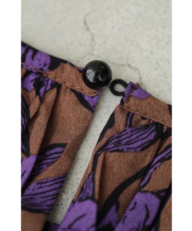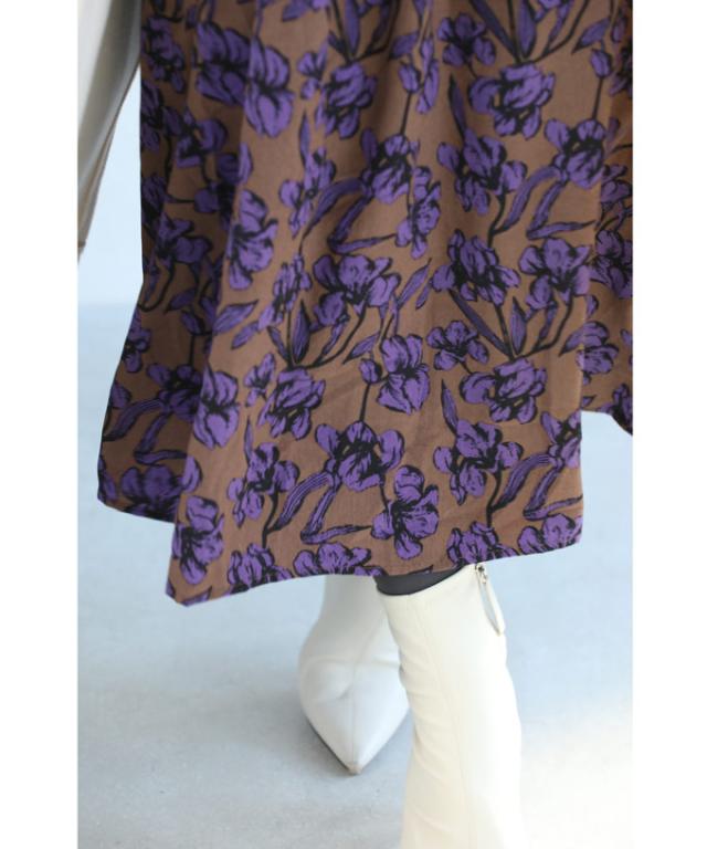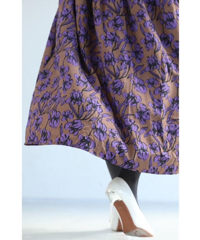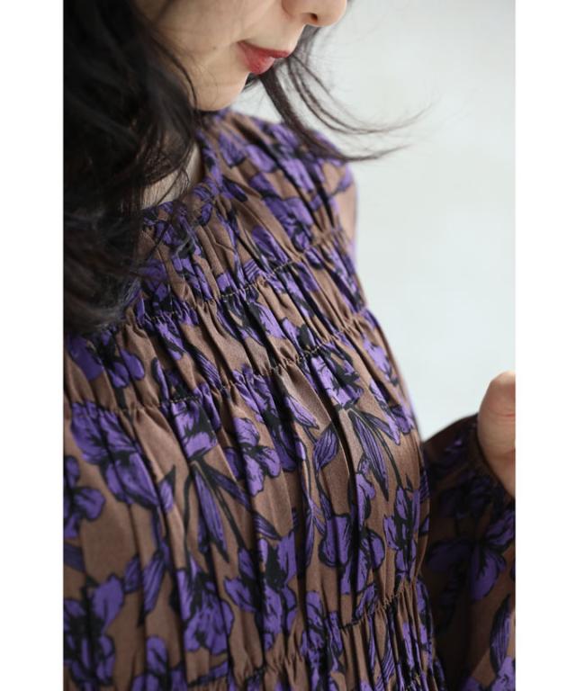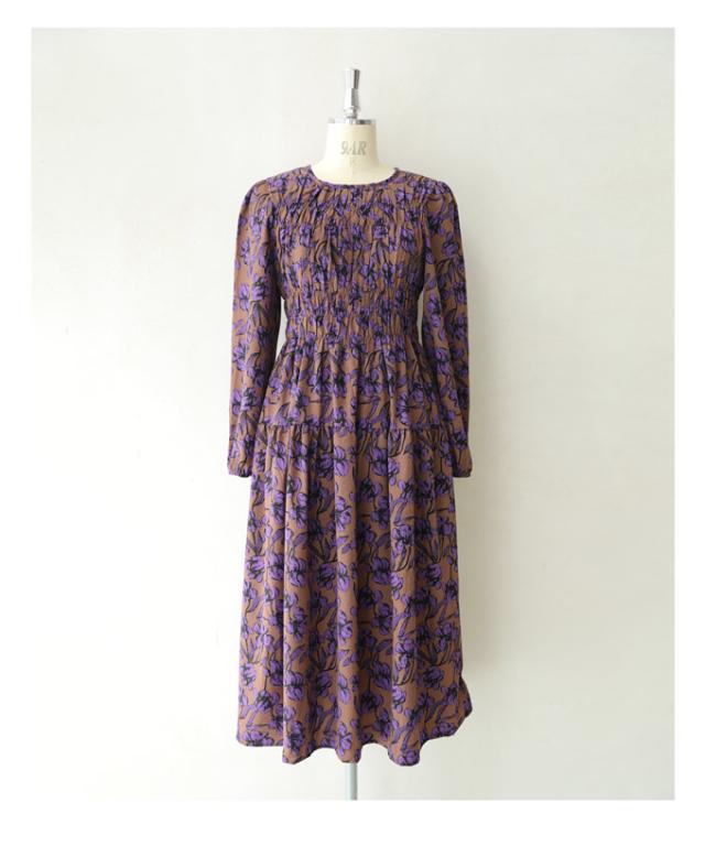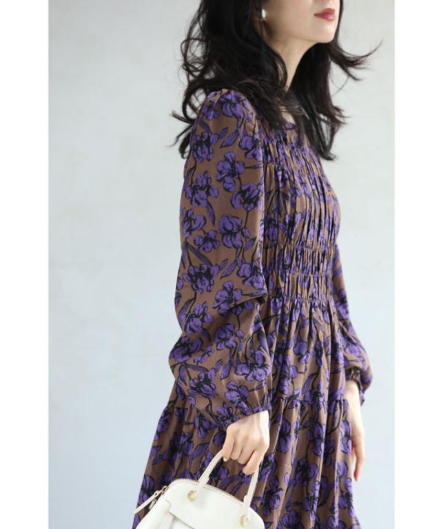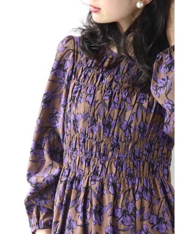 再入荷9月4日 凛と咲く 紫花 シャーリング ミディアム ワンピース 長袖 レディース ファッション 秋服 冬服 cawaii wkg00742 プリーツ パープル 総柄 日常使い 大人可愛い ミセス 30代 40代 50代 体型カバー 母の日