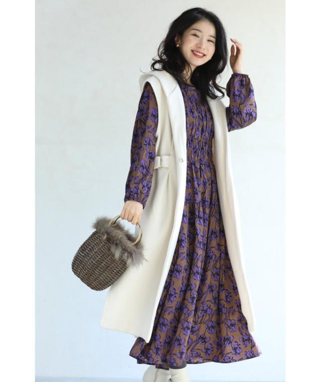 wkg00742 新作 新着 再入荷 CAWAII FRENCHPAVE フレンチパヴェ エレガント ベーシック カジュアル 可愛い かわいい カワイイ おしゃれ オシャレ お洒落 個性 個性的 定番 ベーシック 大人かわいい 大人可愛い 上品 女性らしい デザイン スタンダード ナチュラル きれいめ キレイめ シンプル フェミニン レディース レディースファッション 大人 ママ ミセス 30代 40代 50代 60代 ワンピース 長袖 長そで ロング袖 秋 冬 秋服 秋物 冬服 冬物 パープル 紫 柄 総柄 花 日常着 普段着 日常使い