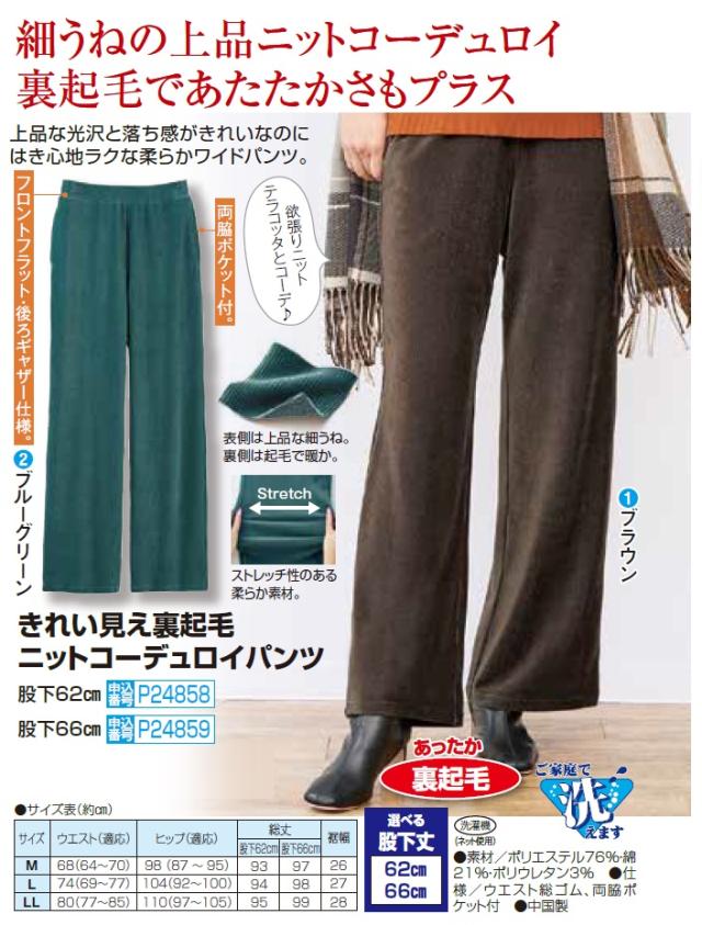 きれい見え裏起毛ニットコーデュロイパンツ 全2色 選べる股下丈 コーデュロイパンツ レディース 婦人服 ミセス シニア 女性 ズボン コール天 ブラウン グリーン 茶色 緑 シニアファッション 40代 50代 60代 70代 80代 母の日 お母さん 秋物 冬物 秋冬