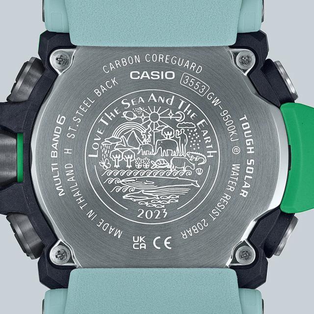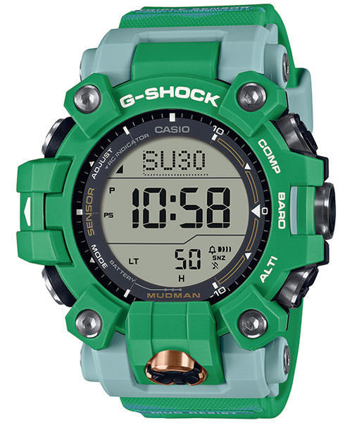 MASTER OF GシリーズのMUDMANを採用。絶滅が危惧されているヒロオビフィジーイグアナをモチーフに、グリーンとブルーの体色を大胆に表現しました。フロントボタンにはイグアナの瞳をイメージしてブラウンIPを施しています。