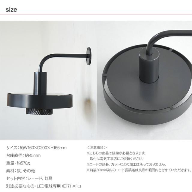 シェード直径約16cm×高さ約16cm×出しろ約20cmの、コンパクトなウォールライトです。