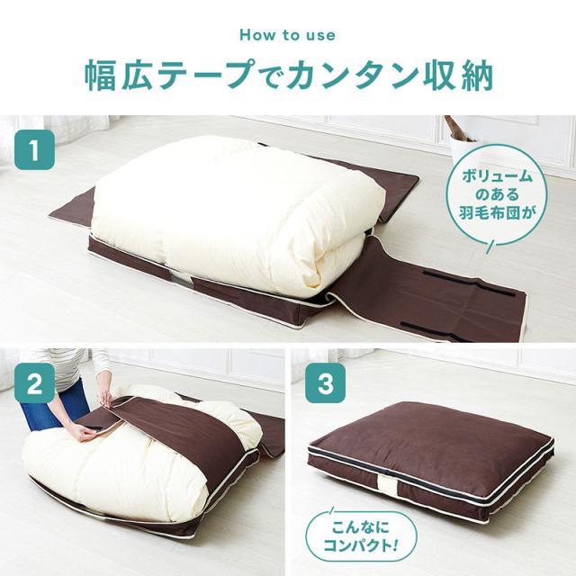 | 使用上のご注意 | ●長時間、直射日光に当たる場所や高温・多湿な場所での使用や保管は、本品や収納物の変色や劣化の恐れがありますのでお避けください。 ●濡れた物を収納しないでください。使用する前に、十分に乾燥させてから収納してください。 ●不織布の特性上、強い引っ張りは破れる恐れがありますので注意してください。 ●収納ケースの上に物を乗せた状態で、収納ケースを引き出さないでください。 ●洗濯やアイロンはお避けください。 ●火気付近で使用しないでください。 ●用途以外には使用しないでください。 ●布団の厚みや大きさにより入らない場合があります。 |