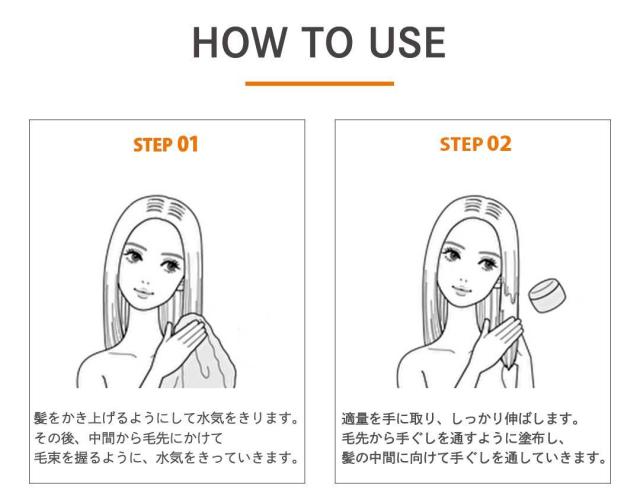 1.シャンプー後、髪をかき上げるように手ぐしを通し、 余分な水気をきります。その後、中間から毛先にかけて毛束を握るように、 水気をきっていきます。(タオルドライも可) 2.適量(セミロングで約25g、マスカット2粒大程度)を手に取り、 両手のひらから指の間までしっかり伸ばす。 毛先付近から手ぐしを通すように塗布し、髪の中間に向かって、 徐々に上から手ぐしを通していきます。 3.指先で毛束をつまみ、毛先方向に向かってすべらせながらなじませる。 質感がつるんとなめらかになるまで、繰り返します。 最後に髪をかき上げるように手ぐしを通し、全体になじませたら塗布完了。 4.5〜10分放置時間をとり、トリートメント成分をしっかり浸透させます。 ホットタオルやヘアキャップで髪を包み込むと、さらに効果的。 5.根元から毛先に向かって手ぐしを通しながら洗い流します。 余分なぬるつきを感じなくなり、しっとりなめらかな状態になるまで。 髪のきしみを感じたら、流しすぎのサインです。 |