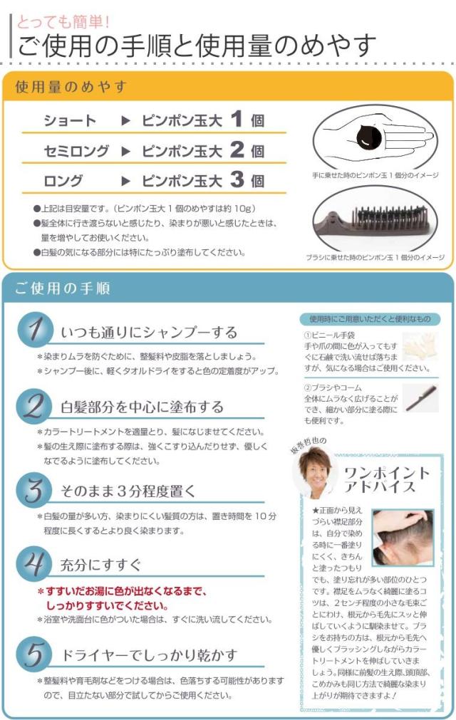 1.シャンプー後、タオル等で髪の水気を取り、 白髪部分を中心に適量をムラなく塗り、3分程度よくなじませます 2.すすいだお湯に色が出なくなるまでしっかりすすぎます 3.タオルで髪の水気を取り、ドライヤーでしっかり乾かします。 |