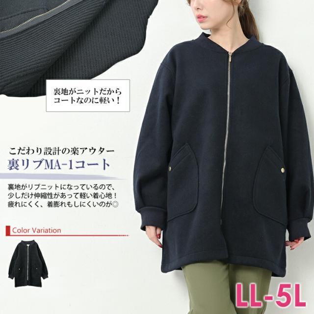 送料無料※沖縄/北海道対象外 大きいサイズ レディース ミドルコート MA-1 長袖 ジップアップ キテ楽コート アウター LL/3L/4L/5L ゆったりサイズ ぽっちゃり女子 プラスサイズ