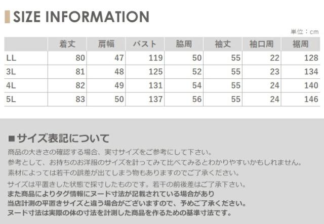 5L:着丈83 肩幅50 バスト137 脇周56 袖丈55 袖口周24 裾周146
