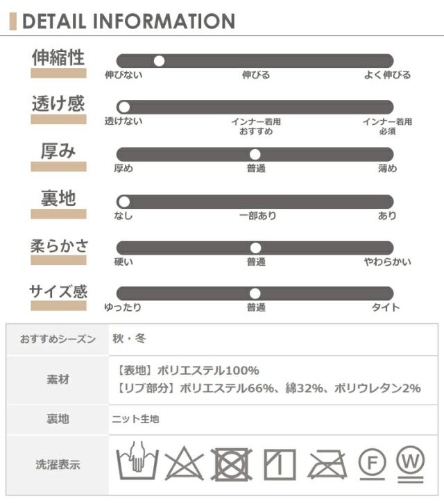 | 素材 | 表地:ポリエステル100% リブ部分:ポリエステル66%、綿32%、ポリウレタン2% |