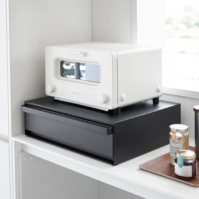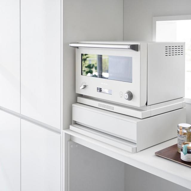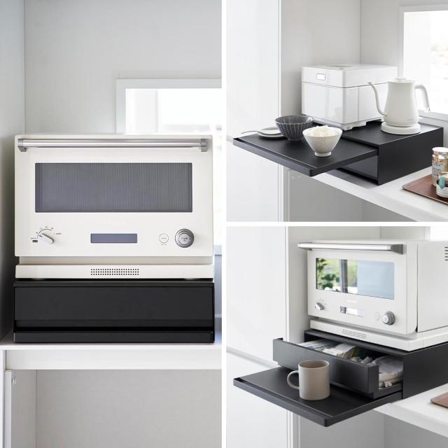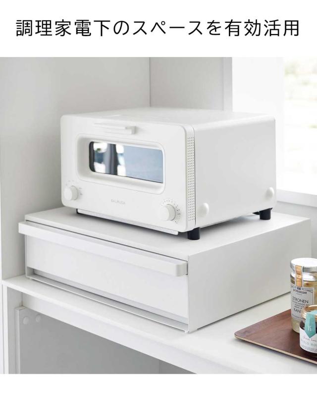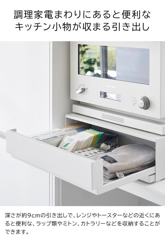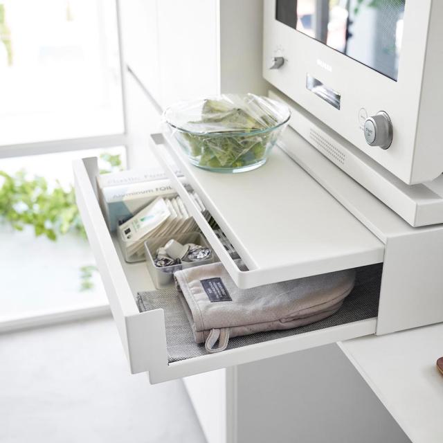 調理家電まわりで必要なラップ類やミトンなどが収まる収納力抜群の引き出しと、必要な時にだけサッと使えるテーブルの2段式ラックです。上下段の入れ替えが可能なツーウェイ設計だから、お好みに合わせてお使いいただけます。調理家電の下に設置すれば、キッチンの限られたスペースでもスマートに整理整頓ができます。