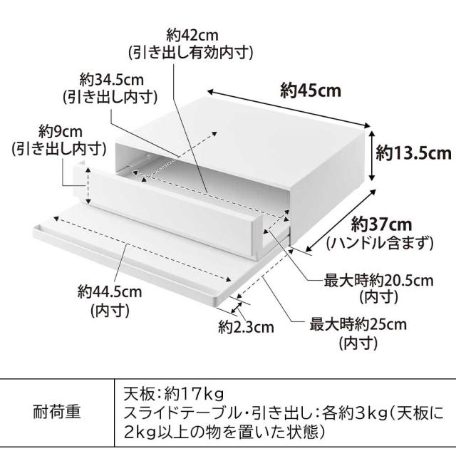 | (約)幅45×奥行39.3〜64×高さ13.5cm 天板(内寸):(約)幅45×奥行37cm スライドテーブル(内寸):(約)幅44.5×奥行25cm 引き出し(内寸):(約)幅42×奥行34.5×高さ9cm |