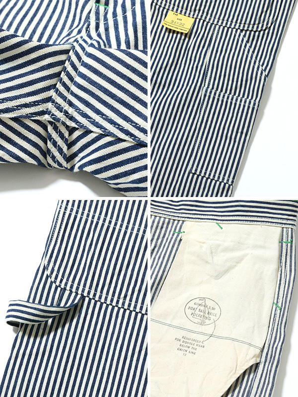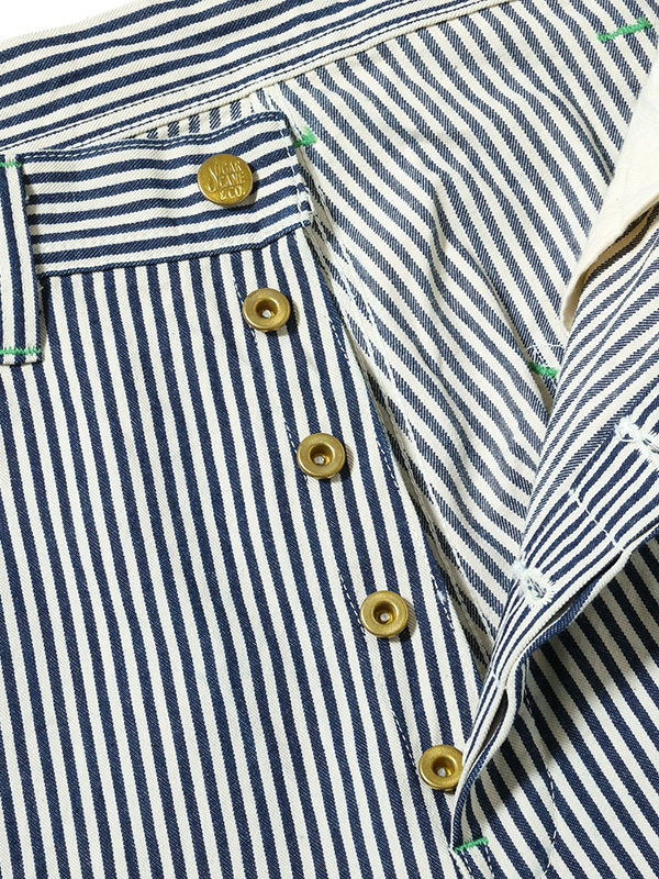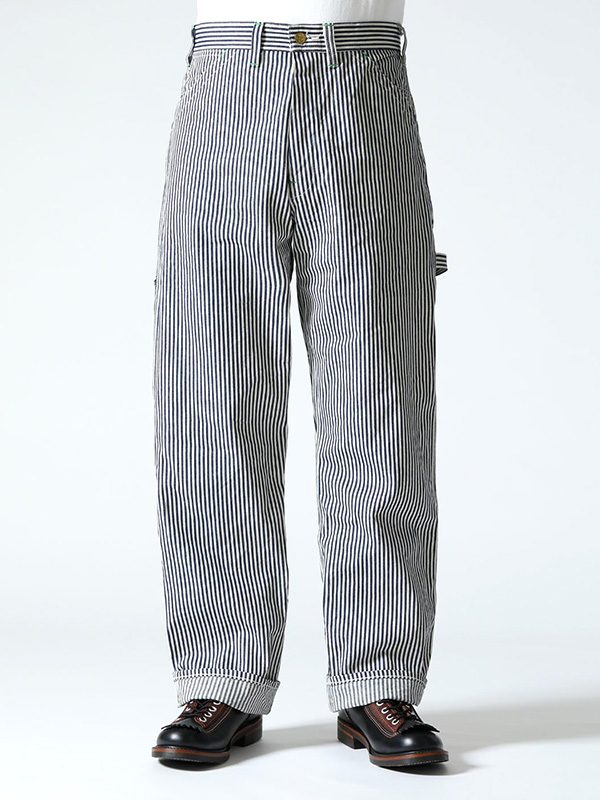 旧式のシャトル織機で織り上げたハリのある11オンスのヒッコリーストライプ生地のワークパンツ。