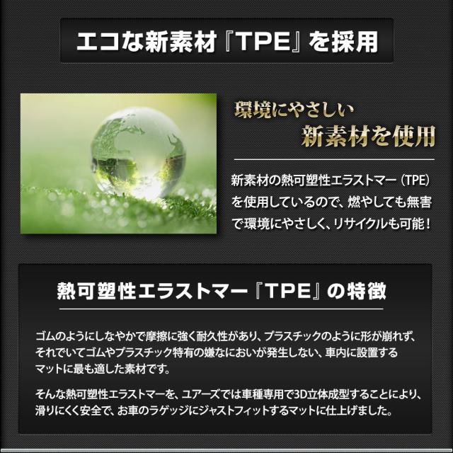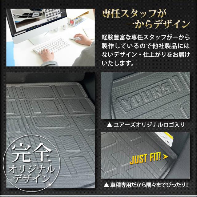 車種専用完全オリジナルデザインの3Dラゲッジマットが新発売 車種専用なので隅々までぴったりフィット! 経験豊富な専任のスタッフが一から製作しているので、他社製品にはないデザインと仕上がりをお届けします。 本品は置くだけだけの簡単設置で汚れや傷からトランク内を保護します。 3Dの立体デザインで縁部分は数センチの立ち上がりがあるので水や汚れをしっかりキャッチ! 完全防水なのでお手入れも簡単! 水や汚れは軽いものならウエスなどで拭くだけでOK! 全面的に汚れた場合は丸洗いも可能なので衛生的です。 新素材の熱可塑性エラストマー(TPE)を使用。 弾力があり、曲げたりすることも可能なので、お車からの取り外しも容易です。 |