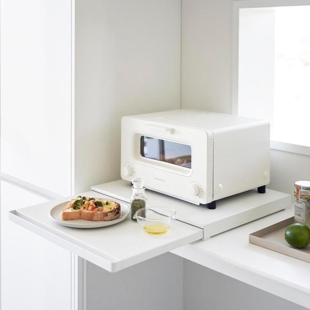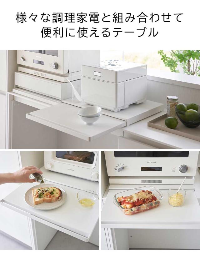 調理家電の下に設置して使う、便利なスライドテーブルです。サッと引き出すだけでスペースが生まれるから、ご飯をよそう際にお茶碗を置いたり、トッピングや仕上げなどの調理台としてすぐに使えます。使わない時は家電下に収納出来るので、キッチンの限られたスペースでも邪魔にならないスマートなテーブルです。キッチンのスペースに合わせて、幅80cmサイズ もお選びいただけます。