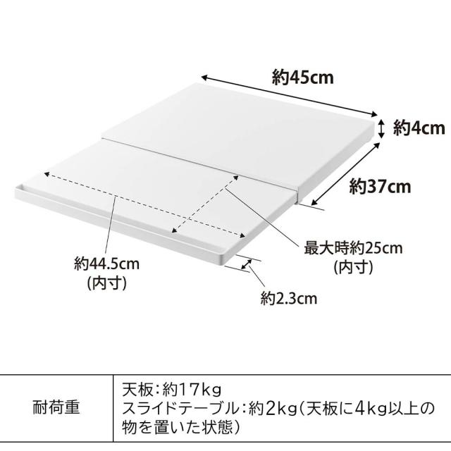 | (約)幅45×奥行39〜64.5×高さ4cm 天板(内寸):(約)幅45×奥行37cm スライドテーブル(内寸):(約)幅44.5×奥行25cm |