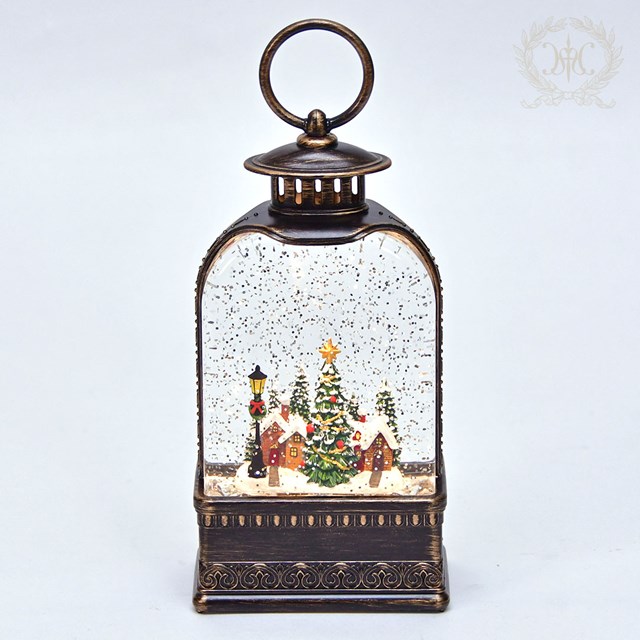 クラシカルなランタンの中に森にたたずむ大きなクリスマスツリーと家々が再現された高級感のあるクリスマスオブジェ。