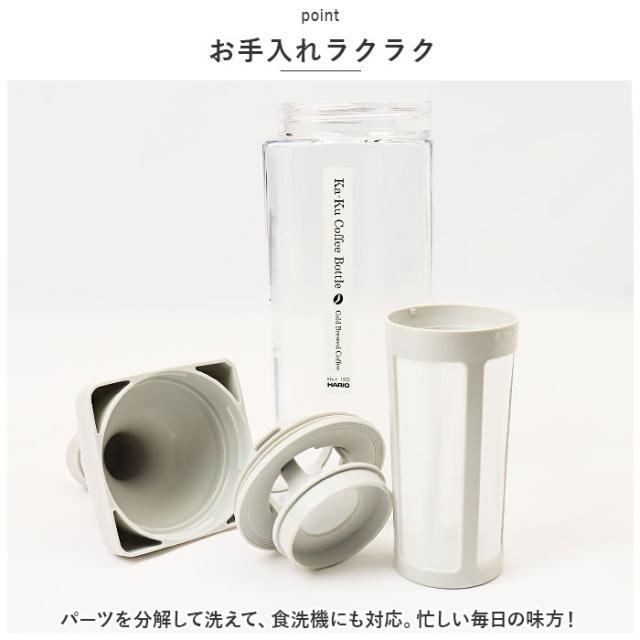 | 商品説明 | ・自宅で手軽にアイスコーヒーを楽しめる♪「HARIO カークコーヒーボトル」が新登場。 【簡単水出しコーヒーボトル】 ・コーヒー粉と水だけで、アイスコーヒーを抽出できるボトル。ストレーナーにコーヒー粉を入れ、注ぎ口にセットしたら少量ずつ水を注ぎ、キャップをして馴染ませ冷蔵庫へ。 【甘味のあるコーヒーが完成】 ・冷蔵庫で8時間抽出すると、雑味のないまろやかなコーヒーの出来上がり◎ストレーナーが付いているから、作ってそのまま注げちゃう! 【使い勝手の良い角型タイプ】 ・容量1500ml、出来上がりの容量は1000ml。冷蔵庫のドアポケットにすっぽり収まり、横置き保存もできて便利! 【軽くて丈夫な安心素材】 ・本体は透明性・耐熱性・衝撃強度のあるPCT樹脂製。軽量で丈夫な、安心の日本製。 【お手入れラクラク】 ・パーツを分解して洗えて、食洗機にも対応。忙しい毎日の味方! 【シンプルでおしゃれなデザイン】 ・空間に馴染むスタイリッシュなデザインで、食卓に出してもおしゃれ♪注ぐ水の量を確認できる目盛り付き。 |