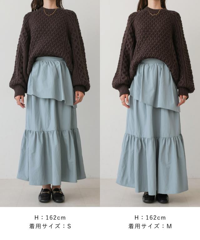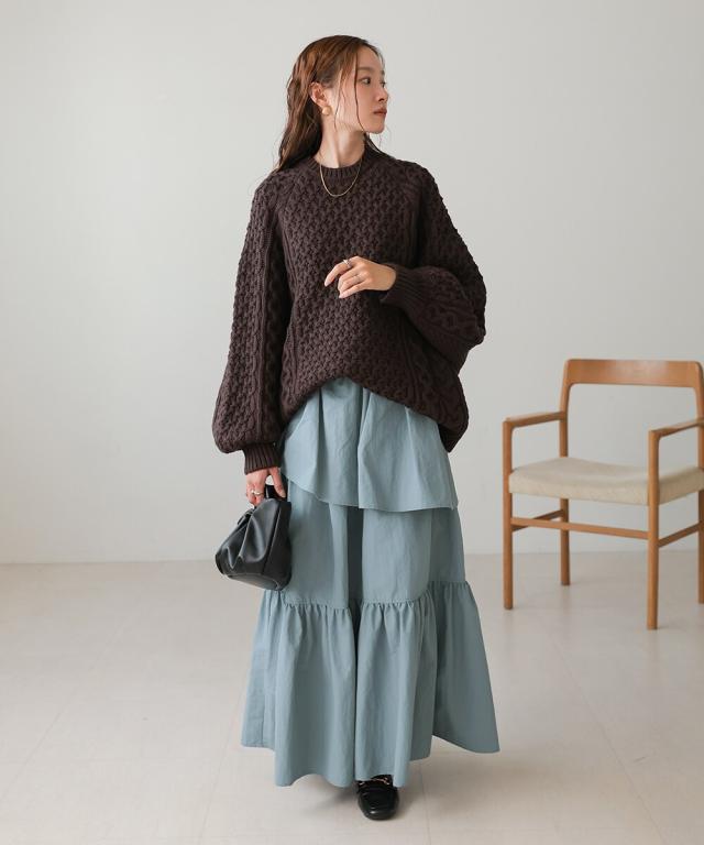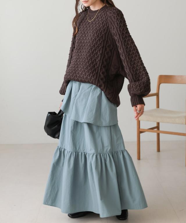 3段ティアードと、ふんだんにあしらわれたギャザーがフェミニンさを引き立てるロングスカート。ボリュームがありながらもくすみカラーで甘すぎず、大人可愛い雰囲気が秋冬コーデに馴染みます。1段目のティアードは裾が縫い付けられていないデザインで、動くたびに遊びがあり着映えも抜群。ウエスト後ろはゴムになっているので着脱しやすく、デザイン性と着心地を両立させた1枚です。