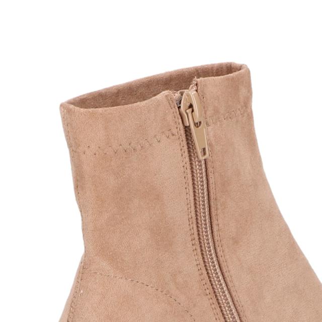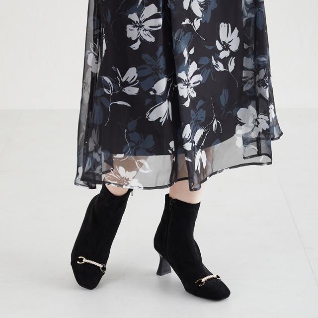 フロント部分にあしらった小粒のビジューとパールが付いたビットモチーフが控えめな甘さを演出するショートブーツは、足当たりの良いストレッチ素材で履き心地も抜群。
