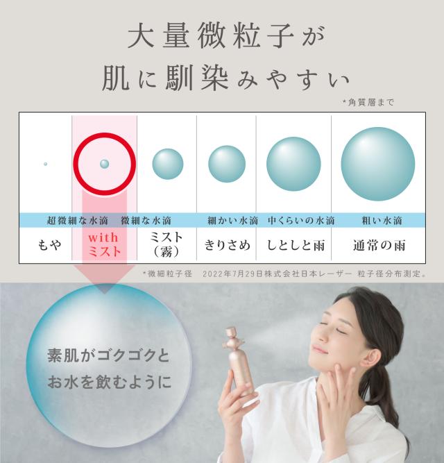 化粧水の粒子をお肌のキメよりも細かく噴霧できるため、肌にいち早くなじむメリット。