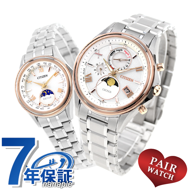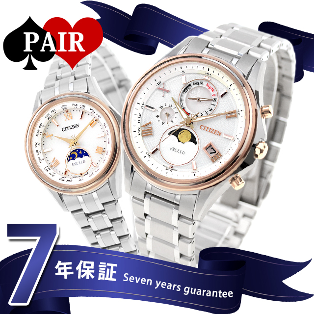 11月16日発売予定 予約受付中 正規品 7年保証キャンペーン 送料無料 ペアウォッチ シチズン エクシード チタン ムーンフェイズ 電波ソーラー 日本製 エコ・ドライブ電波 メンズ レディース 腕時計 pair-exceed30 CITIZEN EXCEED アナログ シルバー ◆確かな品質と洗練されたデザイン。大人のためのドレスウオッチ、シチズン EXCEED(エクシード)。メンズモデルは、月齢自動計算機能「ルナプログラム」搭載。レディースモデルは、サンアンドムーン機能を搭載しています。デザインのテーマは、月に薄い雲がかかったとき、その周囲に光の輪が現れる現象「月暈(つきがさ)」。この現象は「幸せの訪れを意味するもの」として幸運のサインであるという言い伝えがあります。月を金色で表現し、ローマ数字インデックスとともにエレガントな印象を与えています。文字板には、ギョーシェ加工の一種である麦の穂のような「グレンドルジュ」装飾パターンを施しています。 メンズ品番:BY1026-65A レディース品番:EE1016-66A