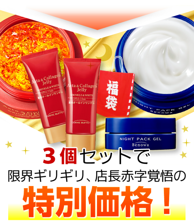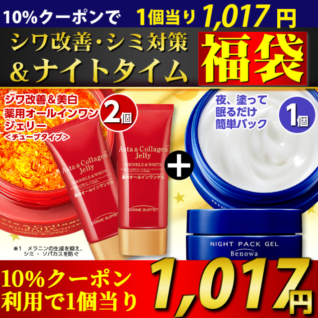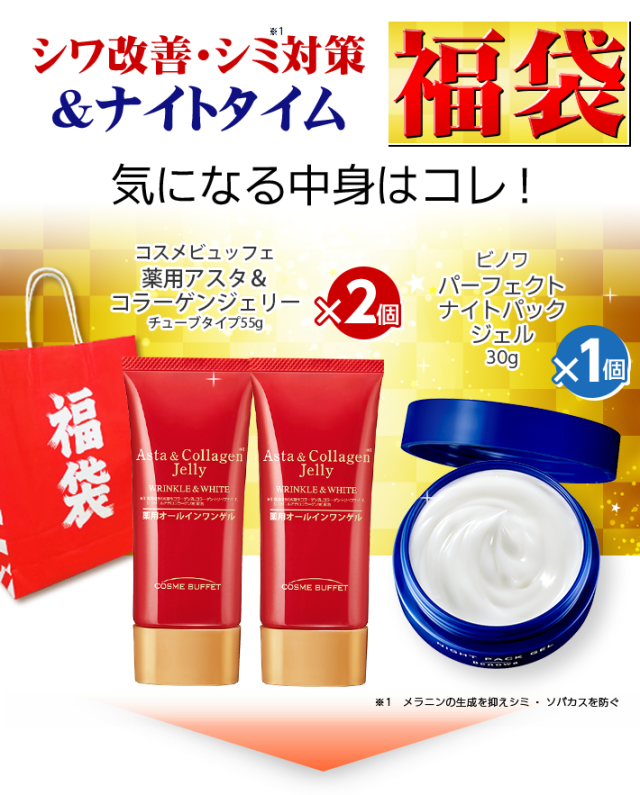 - リピート買いしている者です。この福袋は買って良かったです。赤いジェリーの方はお肌が少し白くなりました。パックは夜使って、朝起きるとお肌がもちもちです。