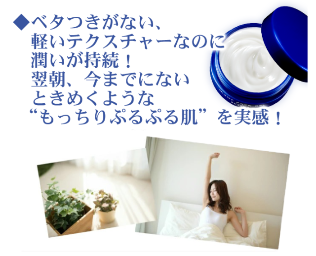 - ナイトタイムは塗ってねるだけなので、簡単でいいです。アスタキサンチンが入っている方は、次の日もしっとりします。