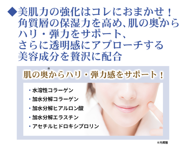 精製水、濃グリセリン、1,3−ブチレングリコール、ポリエチレングリコール・デシルテトラデセス−20・ヘキサメチレンジイソシアネート共重合体、1,2−ペンタンジオール、ヒアルロン酸ナトリウム(2)、アスタキサンチン液、リン酸L−アスコルビルマグネシウム、シクロヘキサンジカルボン酸ビスエトキシジグリコール、イソステアリン酸フィトステリル、N−ステアロイルフィトスフィンゴシン、ヒドロキシステアリルフィトスフィンゴシン、N−ステアロイルジヒドロスフィンゴシン、水素添加大豆リン脂質、ユビデカレノン、フィトステロール、トリメチルグリシン、乳酸ナトリウム液、L−ピロリドンカルボン酸、DL−ピロリドンカルボン酸ナトリウム液、DL−ピロリドンカルボン酸、L−セリン、L−アラニン、グリシン、L−グルタミン酸、塩酸リジン、L−スレオニン、L−アルギニン、L−プロリン、3−O−エチルアスコルビン酸、アシタバエキス、アセチル化ヒアルロン酸ナトリウム、加水分解シルク液、サクシニルアテロコラーゲン液、ブリエラスチン、ジグリセリン、加水分解ヒアルロン酸、コラーゲン・トリペプチド F、水溶性コラーゲン液、ローヤルゼリーエキス、ゲットウ葉エキス、コメヌカエキス、ユキノシタエキス、結晶セルロース、ポリオキシエチレン硬化ヒマシ油、ペンタステアリン酸デカグリセリル、ステアロイル乳酸ナトリウム、クエン酸、クエン酸ナトリウム、水酸化ナトリウム、ベヘニルアルコール、フェノキシエタノール、トリ(カプリル・カプリン酸)グリセリル、ノバラ油
