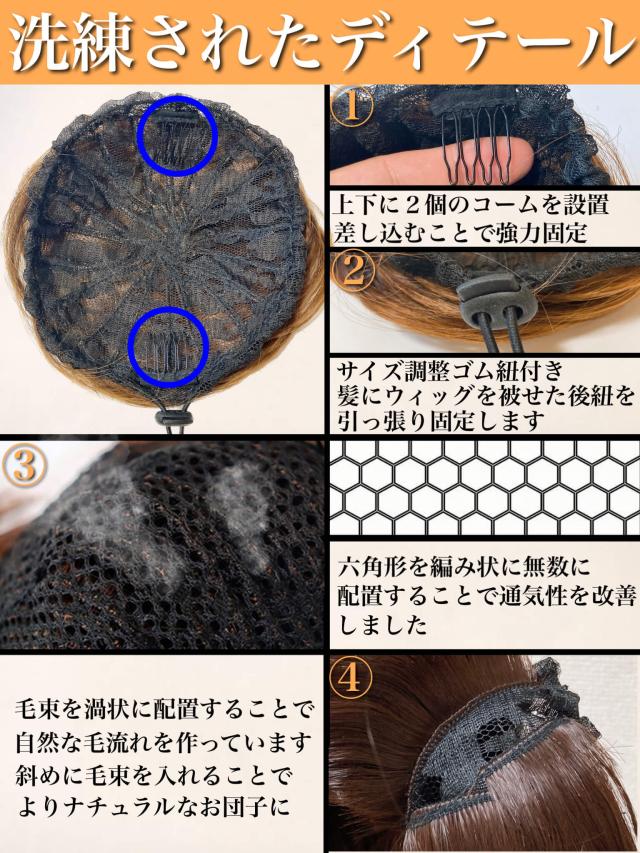 | 特徴1 | 上下2個のコームとサイズ調整ゴム紐で簡単2段階固定。ショートの方でもポニーテールが出来れば使用可能 |