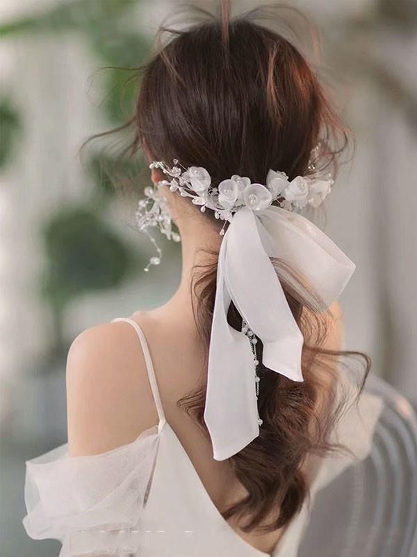 髪飾り リボン 花 ウェディング ブライダル 韓国風 パーティー 二次会 披露宴 花嫁 結婚式 前撮り 後撮り 演奏会 謝恩会 演出 イベント お呼ばれ 舞台 成人式 写真用 撮影用 ヘアアクセ ヘアアクセサリー 白 かわいい シンプル エレガント 豪華 森ガール 上品 フォーマル