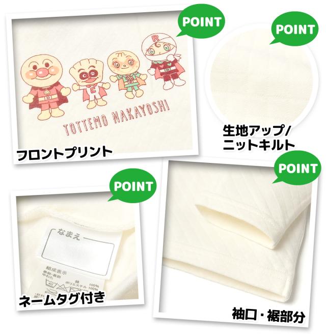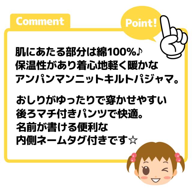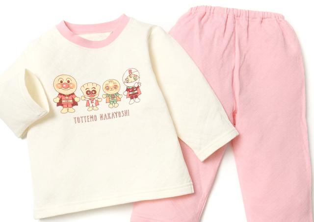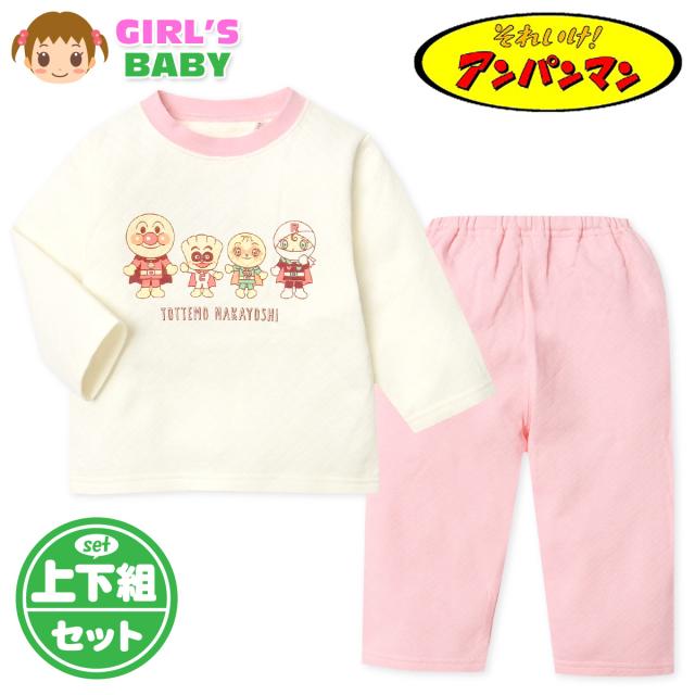 【送料無料】女児 ベビー ニットキルト 長袖 パジャマ アンパンマン 上下組 あったか 保温 肌側綿100% iw-0978a-pk【メール便対応】